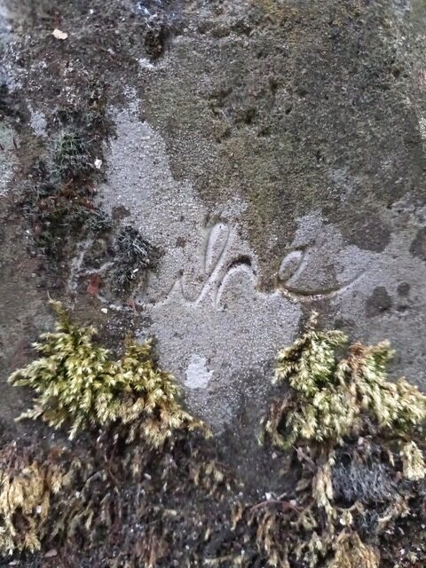 eingehauene Schrift, ein Jahr in Ruhe gelassen, mit Flechten und Moosen bewachsen;